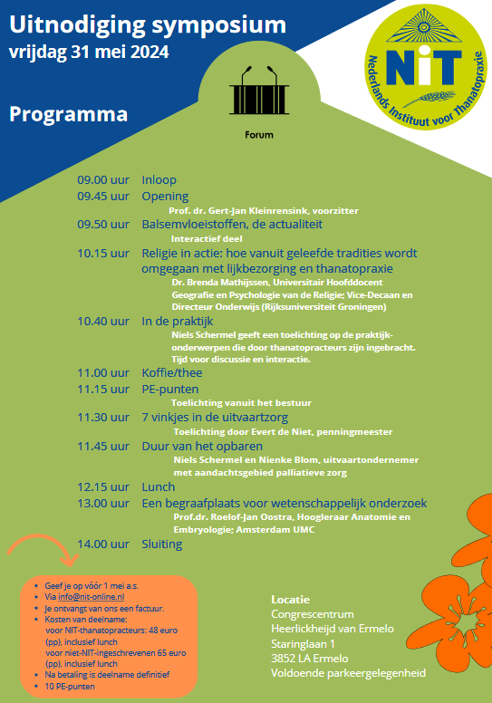 Interactie, lezingen en ontmoetingen staan centraal. Met sprekers als Brenda Mathijssen, Nienke Blom en Roelof-Jan Oostra is er een inspirerende mix aan onderwerpen. Natuurlijk komen de balsemvloeistoffen aan bod, waar momenteel door een toelating van het Ctgb veel reuring is door ontstaan. Daarnaast gaat een van de onderwerpen over tradities en religie bij lijkbezorgen en wat dat betekent voor thanatopraxie. En welke gevolgen heeft een langere duur van opbaren voor thanatopraxie? Ook dat wordt aan de kaak gesteld. Tenslotte eindigt het symposium met een lezing over een begraafplaats voor wetenschappelijk onderzoek. Voor het volledig programma klik hier programma symposium.